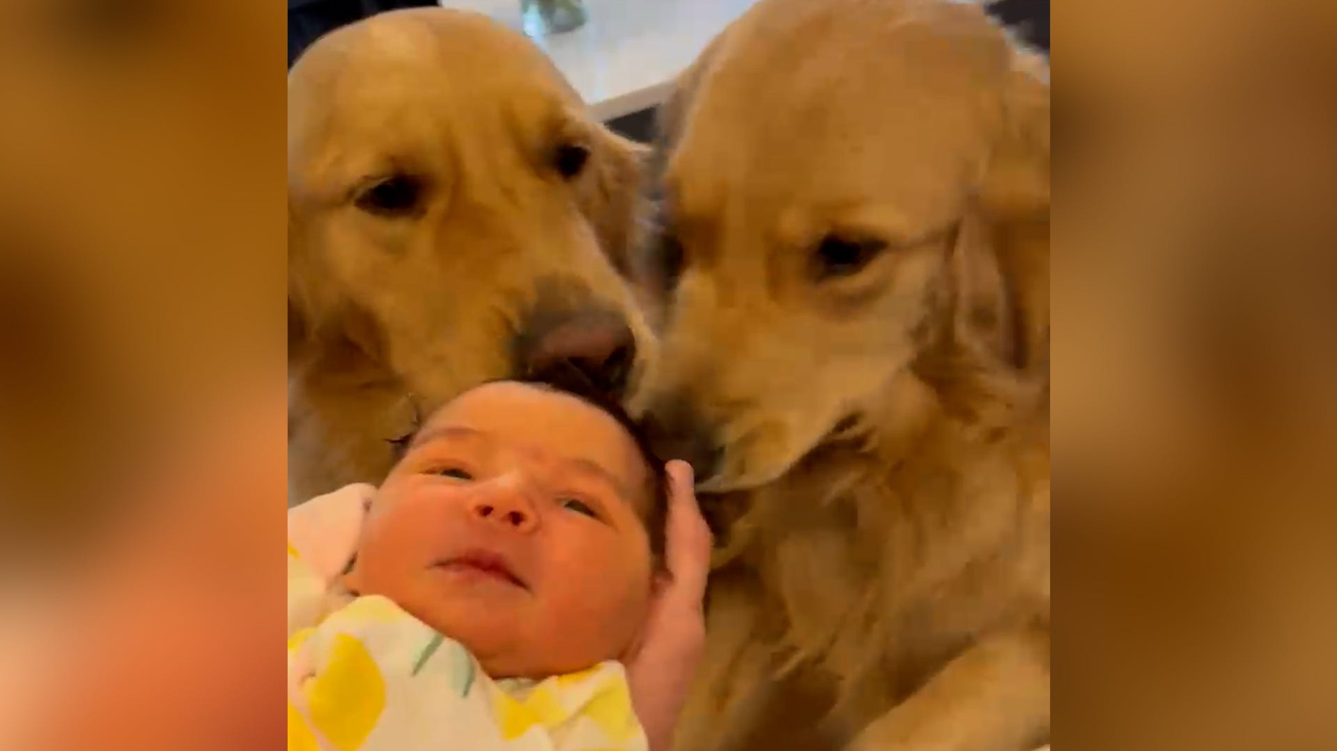Golden Retrievers in Richmond, Virginia meet 3 day old newborn Miller for the first time, embracing her with kisses.